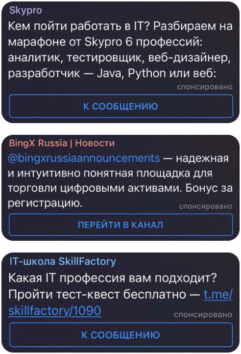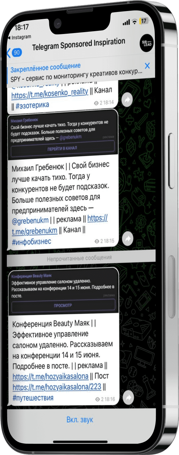 Наш специальный алгоритм находит в тысячах разных каналов телеграмм креативы telegram ads. Предусмотрен парсинг более чем по 26 тематикам.