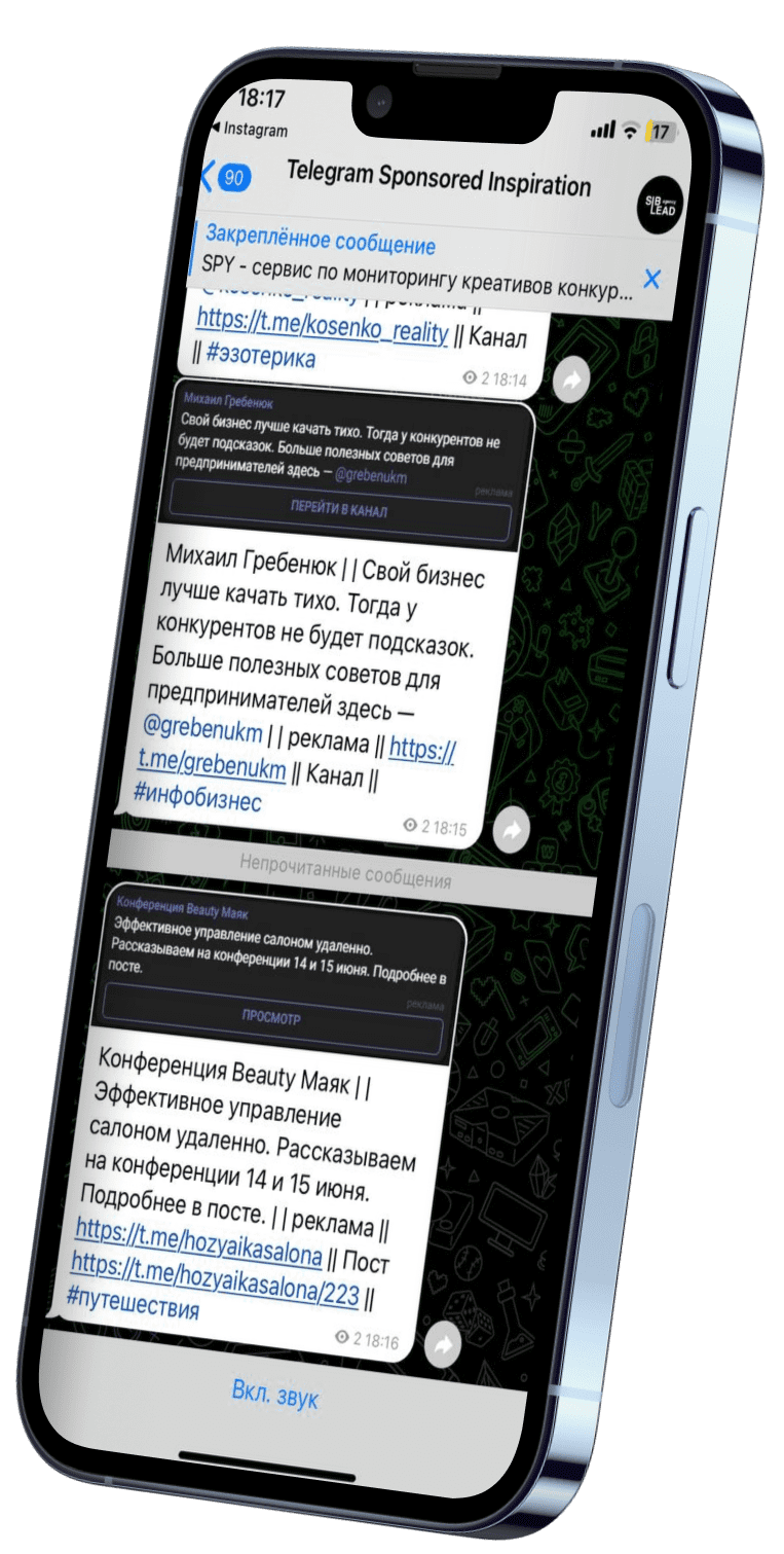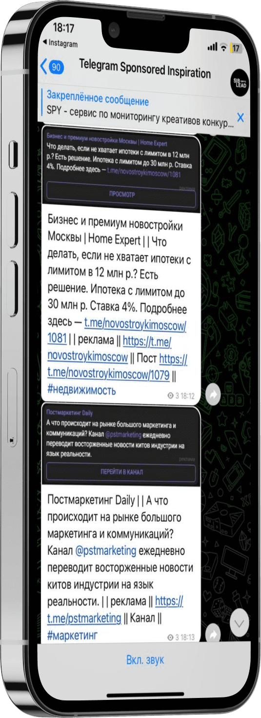 За подписку вы получаете доступ в телеграмм канал, в который ежедневно попадает 1300+ новых актуальных креативов Telegram Ads со всего Telegram. В базе уже более 100 000 креативов.